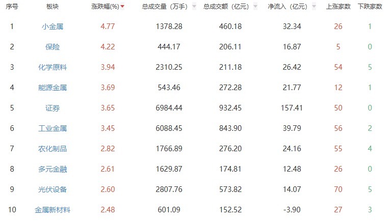板块方面,小金属、保险、化学原料等板块涨幅居前,美容护理、元件板块下跌。