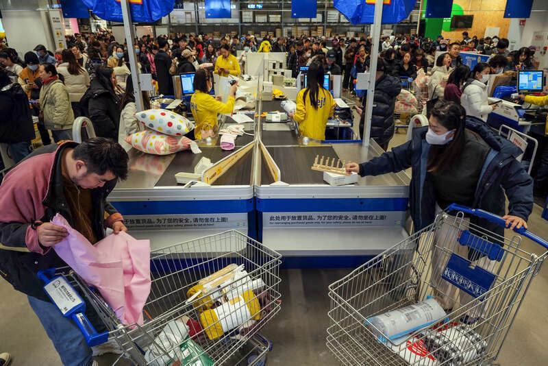 1月15日,顾客在宜家天津中北店收银台排队结账。当日,宜家天津中北店启动闭店前清仓折扣活动。宜家中国1月7日正式公布战略调整计划,宣布自2月2日起停止运营上海宝山店、广州番禺店、天津中北店等七家商场。 视觉中国供图