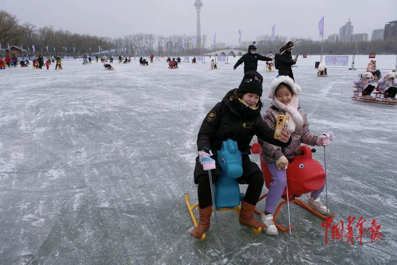 1月17日,北京玉渊潭公园,两名游客在冰车上自拍留念。时隔六年,玉渊潭公园冰场今冬以全新面貌迎客,倾力打造近2万平方米的冰上乐园,提供1400辆各式冰车,并融合多种冰上娱乐项目,为市民游客呈现一场冰上嘉年华。中青报·中青网记者 田嘉硕/摄