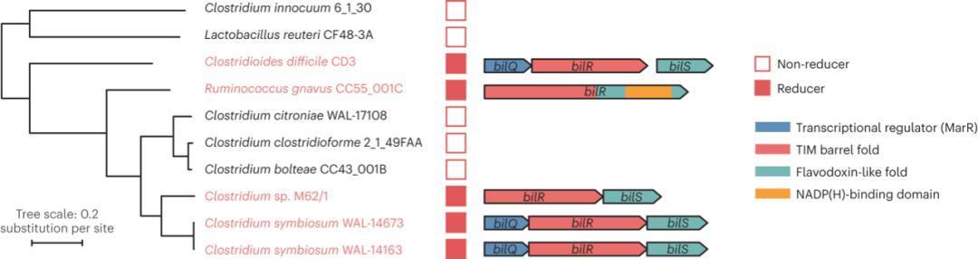 操纵子结构分析显示,bilR常与bilQ(MarR家族转录调控因子)、bilS(黄素氧还蛋白样蛋白)形成复合操纵子,存在三种核心组合形式:Clostridioides difficile CD3及两株Clostridium symbiosum含bilQ-bilR-bilS完整形式,Clostridium sp. M62/1含bilR-bilS简化形式,Ruminococcus gnavus CC55_001C仅含单一bilR基因(图2)。AlphaFold预测显示,Ruminococcus gnavus的BilR含N端TIM桶结构域(与其他bilR全长序列同源)及额外C端黄素氧还蛋白样结构域、NADP(H)结合结构域,Clostridium symbiosum的BilR与BilS具有相似折叠模式;且Ruminococcus gnavus的BilR与大肠杆菌2,4-二烯酰辅酶A还原酶(PDB:1PS9)具有明显的同源性(蛋白一致性29.82%,RMSD=2.79),进一步支持其催化功能。