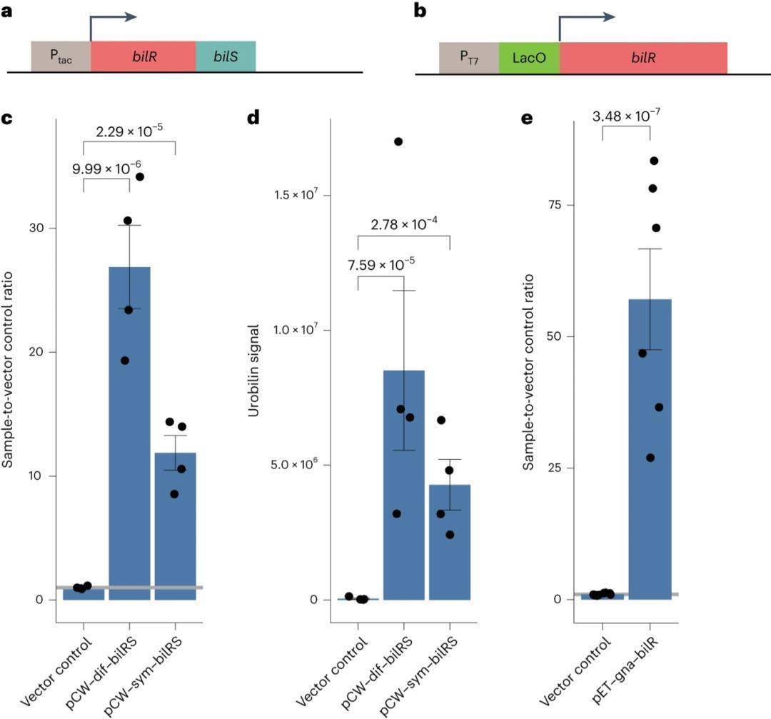 为验证BilR的催化功能,研究团队构建三种异源表达体系(图3a、3b)。荧光检测结果显示,表达两种短链bilRS及长链bilR的重组大肠杆菌,荧光信号均显著高于空载体对照组(图3c、3e);LC-MS/MS进一步验证,重组菌株样品中检测到尿胆素特征峰,未检测到粪胆素峰,证实荧光实验可可靠指示胆红素向尿胆原的还原(图3d),且空载体对照组无还原活性。此外,天然胆红素还原菌株与表达bilRS的大肠杆菌,还能有效催化中胆红素(胆红素结构类似物)的还原,表明BilR对胆红素类底物具有广泛催化适用性。
