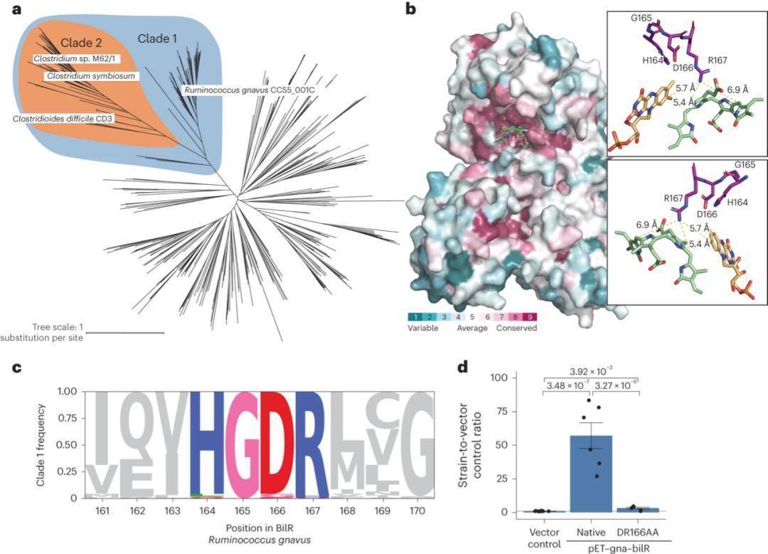 构建BilR与古老黄酶家族相关还原酶的基因进化树,明确实验验证的胆红素还原酶集中于Clade 1(蓝色高亮),短链bilR变体形成独立的Clade 2(橙色高亮)(图4a)。为验证HGDR基序的功能,研究团队构建Ruminococcus gnavusbilR的定点突变体(D166A/R167A),圆二色谱分析显示突变体蛋白折叠结构与野生型一致(排除结构破坏影响),但荧光实验显示其还原活性显著下降,证实D166和R167是催化关键残基(图4d)。