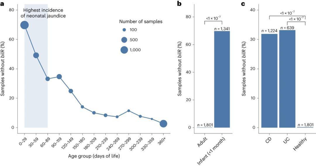 研究团队对4296份婴儿出生后1年内的肠道宏基因组样本进行分析,按30天龄分组统计bilR缺失率:出生前3个月bilR缺失率极高,而这一时期正是新生儿黄疸的高发期;随年龄增长,缺失率逐渐下降,至1岁时基本接近成人水平(图6a)。这一趋势表明,肠道菌群中bilR的定植情况与新生儿黄疸风险密切相关。