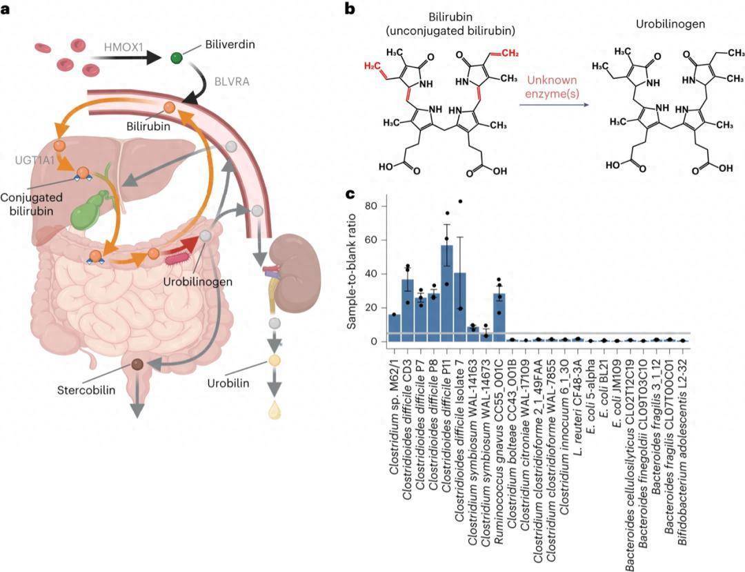 BilR的发现填补了血红素代谢通路的关键缺口,明确肠道微生物通过BilR催化胆红素还原为尿胆原,促进其排泄以维持胆红素稳态,其缺失或功能异常可能引发新生儿黄疸、IBD相关肝胆结石等疾病。该研究的理论价值在于首次阐明肠道微生物介导胆红素还原的分子机制,深化了对肠肝轴的理解,同时揭示了BilR的保守序列特征与进化规律;临床意义体现在为新生儿黄疸和IBD提供了新的病理解释——新生儿黄疸高发可能与早期肠道BilR阳性菌株定植不足相关,IBD患者的胆红素结石风险升高可能与bilR缺失导致的代谢紊乱相关,未来可通过补充BilR阳性菌株、调控bilR表达等微生物干预策略,预防和治疗胆红素代谢相关疾病;从应用角度看,BilR的鉴定为开发胆红素检测工具、设计靶向药物提供了新靶点。