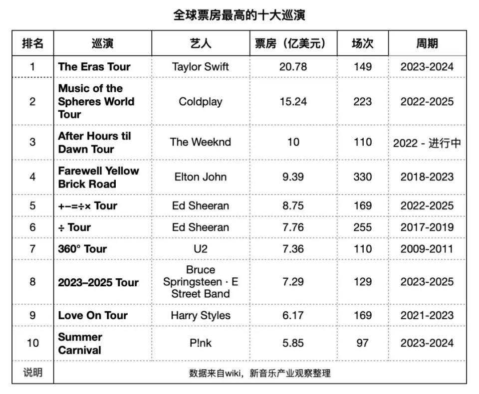 2023 年至今,Taylor Swift、Coldplay 和 The Weeknd 的巡演票房收入先后跨过 10 亿美元门槛,其中,Taylor Swift 的“时代巡演”总票房突破 20 亿美元(约 140 亿元人民币),将巡演的收入级别提升到了前所未有的新高度。