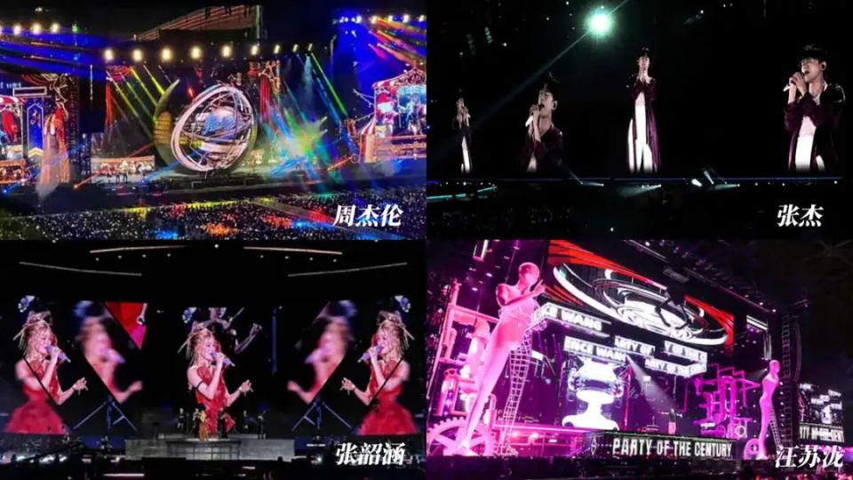 以巨型 LED 屏为例,2025 年,国内演唱会舞美中 LED 显示屏的应用令人眼花缭乱。周杰伦巡演通过巨型球形屏与透明屏构建全方位视觉场域,张杰鸟巢演唱会使用超大面积透明屏和地砖屏打造横跨全场的视觉效果,张韶涵巡演依托高刷新率、高色彩还原度巨幕实现光影与情感同步,汪苏泷演唱会通过黑灯透明屏、异形定制屏与 360 ° 环形巨幕构建科幻沉浸空间。